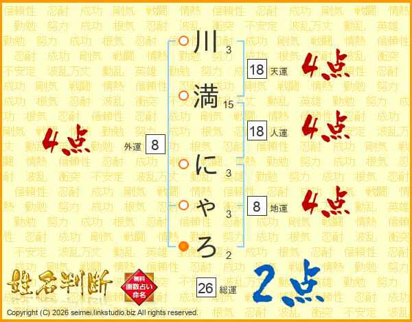 川(3画)満(15画) に(3画)ゃ(3画)ろ(2画)