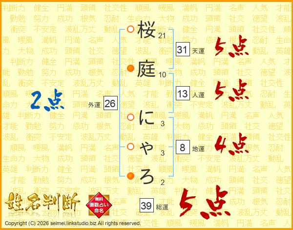 桜(21画)庭(10画) に(3画)ゃ(3画)ろ(2画)