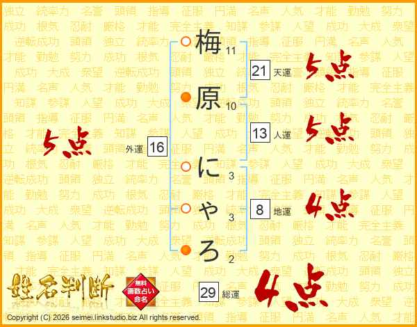 梅原にゃろさんの総運は29画の4点!
