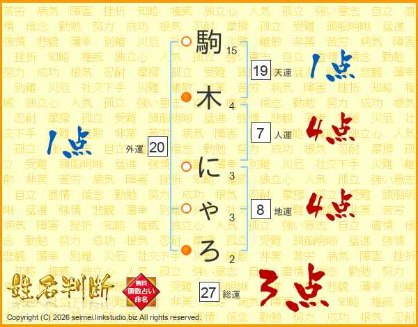 駒(15画)木(4画) に(3画)ゃ(3画)ろ(2画)