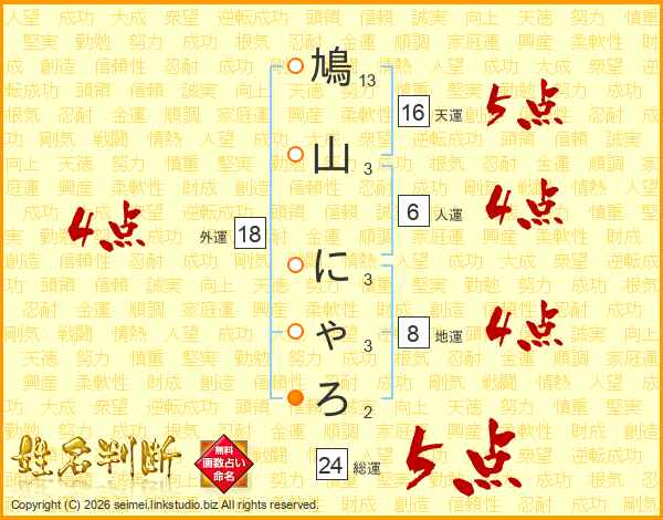 鳩山にゃろさんの総運は24画の5点!