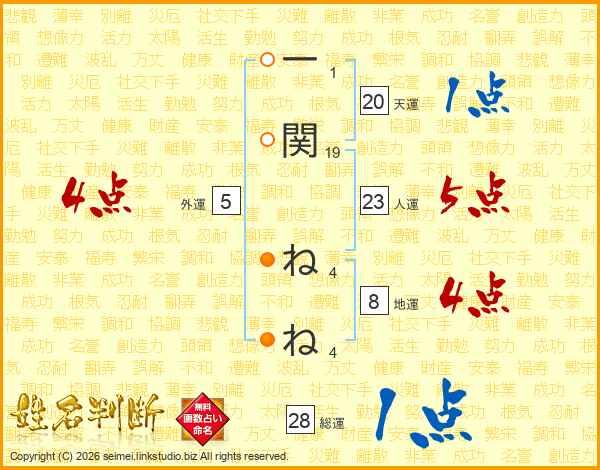 生活面を象徴する運勢です。外部から受ける影響力を表し、結婚運、家庭運や職場、環境への順応性を表します。総運から人運を引いた画数。姓や名が1文字の場合を除く。