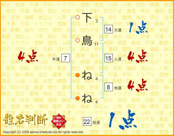 下(3画)鳥(11画) ね(4画)ね(4画)