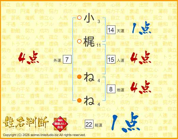 生活面を象徴する運勢です。外部から受ける影響力を表し、結婚運、家庭運や職場、環境への順応性を表します。総運から人運を引いた画数。姓や名が1文字の場合を除く。