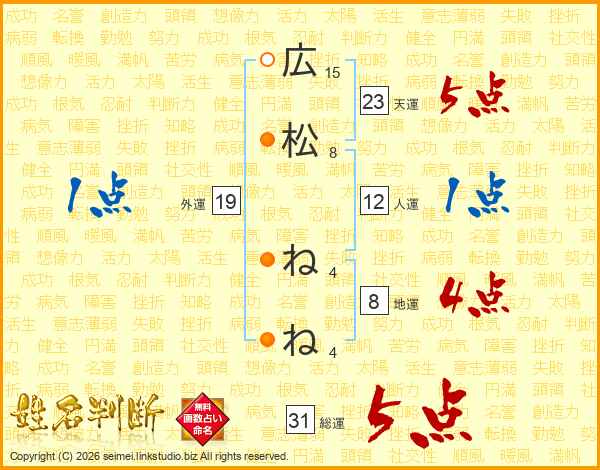 生活面を象徴する運勢です。外部から受ける影響力を表し、結婚運、家庭運や職場、環境への順応性を表します。総運から人運を引いた画数。姓や名が1文字の場合を除く。