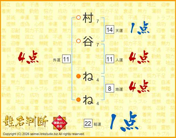 生活面を象徴する運勢です。外部から受ける影響力を表し、結婚運、家庭運や職場、環境への順応性を表します。総運から人運を引いた画数。姓や名が1文字の場合を除く。