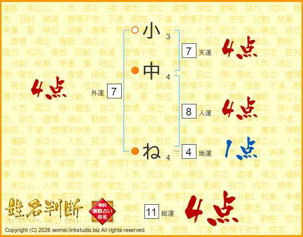 小中ねさんの総運は11画の4点!