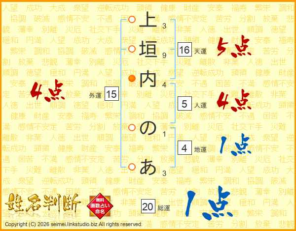 上(3画)垣(9画)内(4画) の(1画)あ(3画)