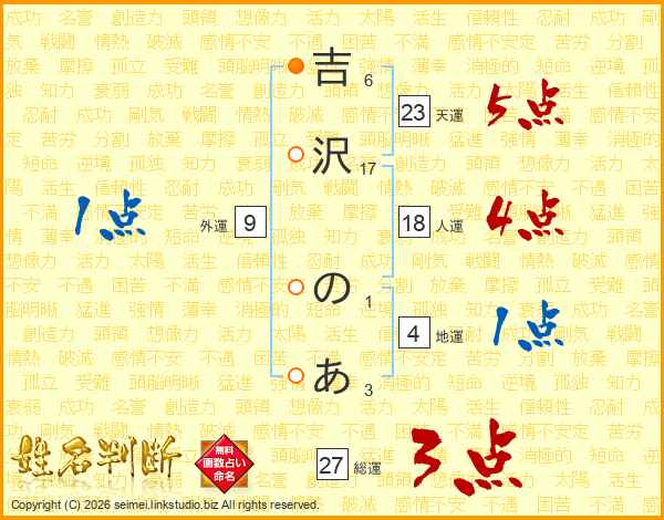 吉沢のあさんの総運は27画の3点!