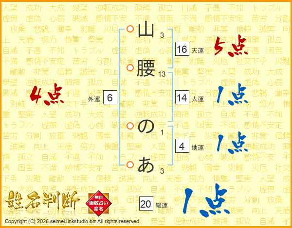 山腰のあさんの総運は20画の1点!