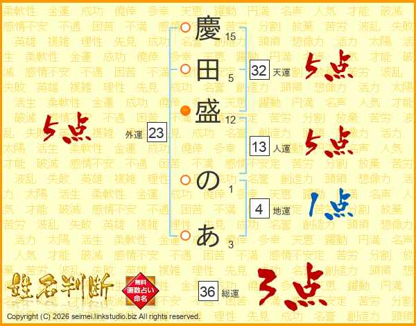 慶(15画)田(5画)盛(12画) の(1画)あ(3画)