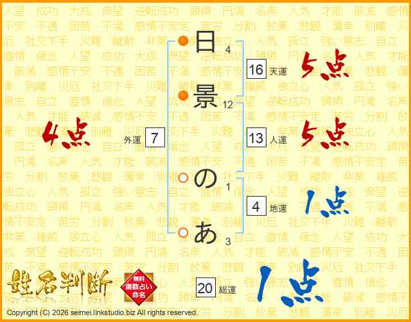 生活面を象徴する運勢です。外部から受ける影響力を表し、結婚運、家庭運や職場、環境への順応性を表します。総運から人運を引いた画数。姓や名が1文字の場合を除く。