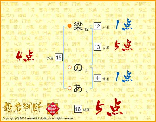 梁のあさんの総運は16画の5点!