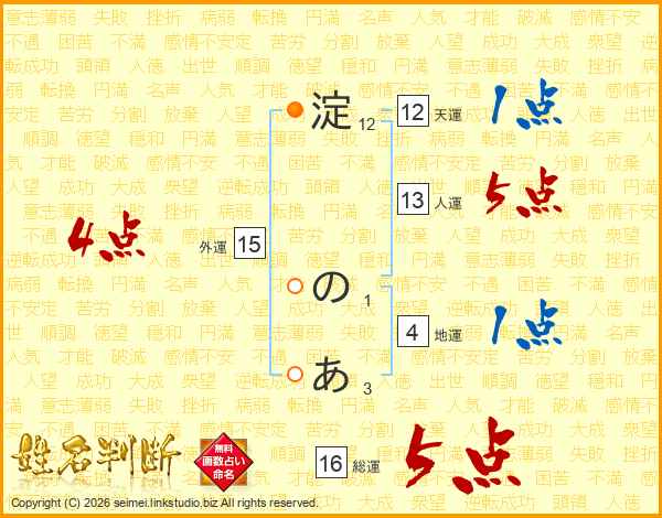 生活面を象徴する運勢です。外部から受ける影響力を表し、結婚運、家庭運や職場、環境への順応性を表します。総運から人運を引いた画数。姓や名が1文字の場合を除く。
