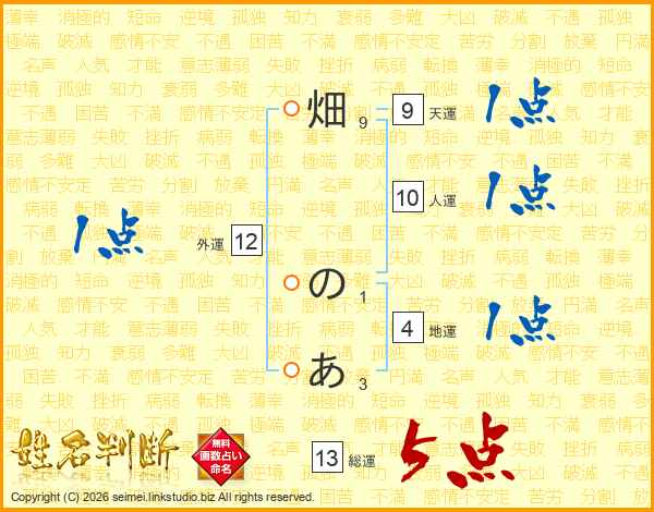 生活面を象徴する運勢です。外部から受ける影響力を表し、結婚運、家庭運や職場、環境への順応性を表します。総運から人運を引いた画数。姓や名が1文字の場合を除く。
