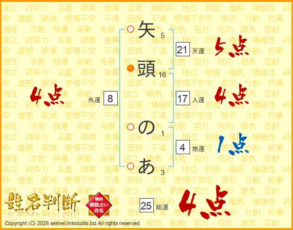 矢頭のあさんの総運は25画の4点!