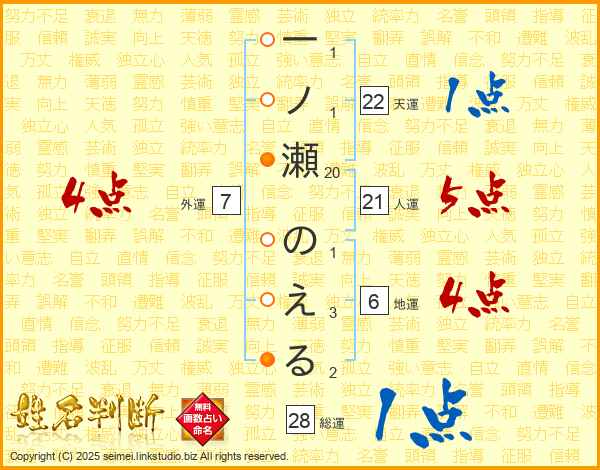 生活面を象徴する運勢です。外部から受ける影響力を表し、結婚運、家庭運や職場、環境への順応性を表します。総運から人運を引いた画数。姓や名が1文字の場合を除く。