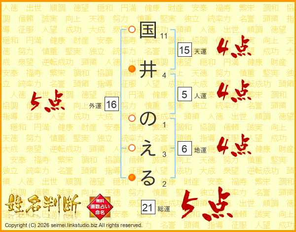 あなたの人生を表す1番重要な運勢です。生涯を通じて影響する総合運となり、主に50歳以降の晩年期に影響を及ぼします。苗字と名前の合計画数。