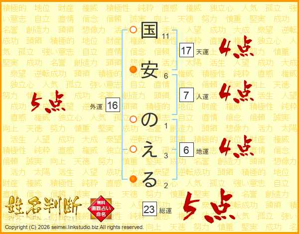 国(11画)安(6画) の(1画)え(3画)る(2画)