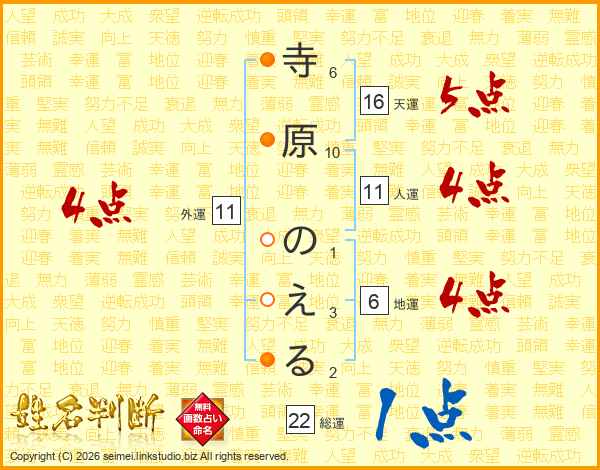 寺原のえるさんの総運は22画の1点!