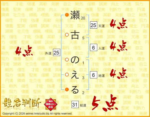 瀬(20画)古(5画) の(1画)え(3画)る(2画)
