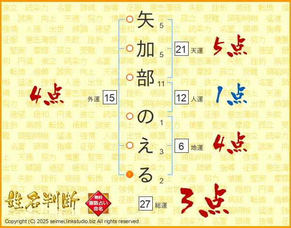 矢(5画)加(5画)部(11画) の(1画)え(3画)る(2画)