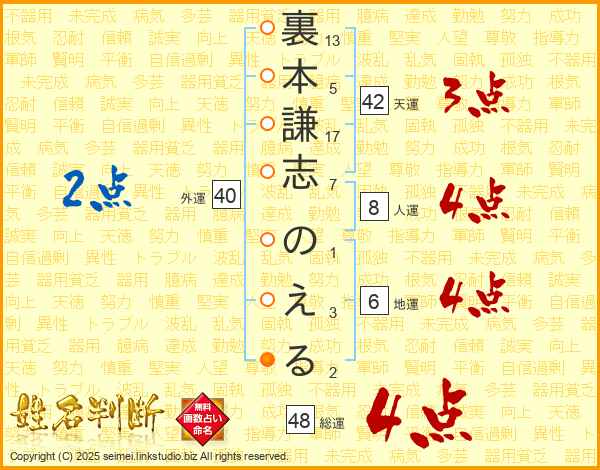裏本謙志のえるさんの総運は48画の4点!