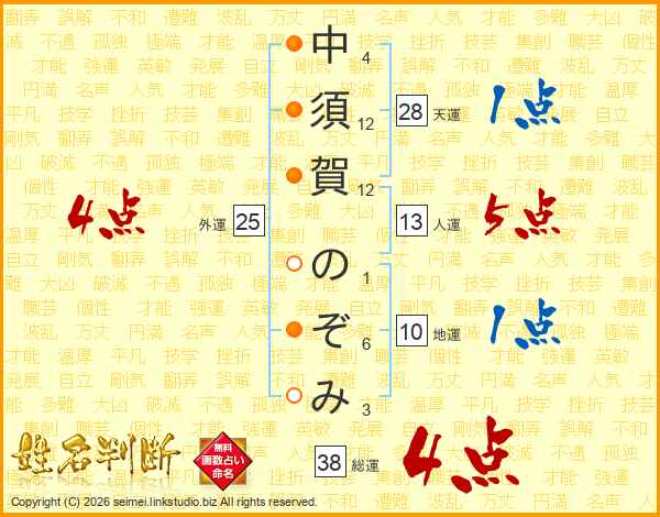 中(4画)須(12画)賀(12画) の(1画)ぞ(6画)み(3画)