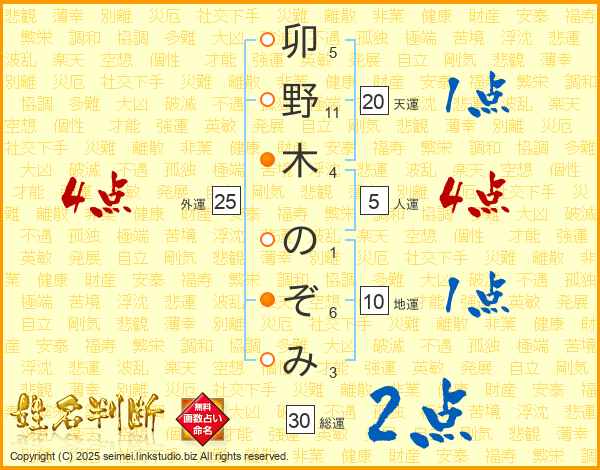 卯(5画)野(11画)木(4画) の(1画)ぞ(6画)み(3画)