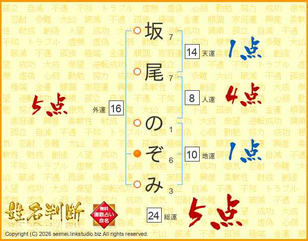 坂尾のぞみさんの総運は24画の5点!