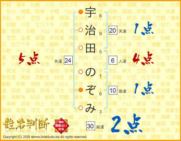 宇(6画)治(9画)田(5画) の(1画)ぞ(6画)み(3画)