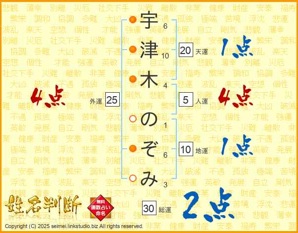 宇(6画)津(10画)木(4画) の(1画)ぞ(6画)み(3画)
