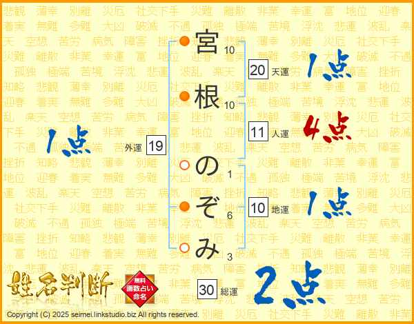 宮(10画)根(10画) の(1画)ぞ(6画)み(3画)