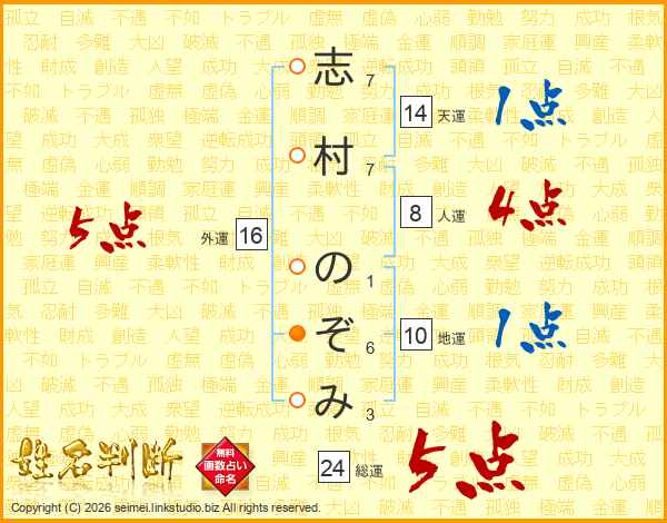 生活面を象徴する運勢です。外部から受ける影響力を表し、結婚運、家庭運や職場、環境への順応性を表します。総運から人運を引いた画数。姓や名が1文字の場合を除く。