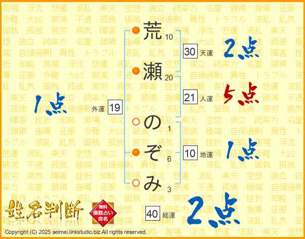 生活面を象徴する運勢です。外部から受ける影響力を表し、結婚運、家庭運や職場、環境への順応性を表します。総運から人運を引いた画数。姓や名が1文字の場合を除く。