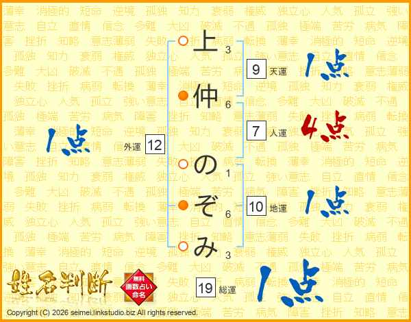 生活面を象徴する運勢です。外部から受ける影響力を表し、結婚運、家庭運や職場、環境への順応性を表します。総運から人運を引いた画数。姓や名が1文字の場合を除く。