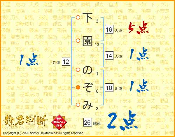 生活面を象徴する運勢です。外部から受ける影響力を表し、結婚運、家庭運や職場、環境への順応性を表します。総運から人運を引いた画数。姓や名が1文字の場合を除く。