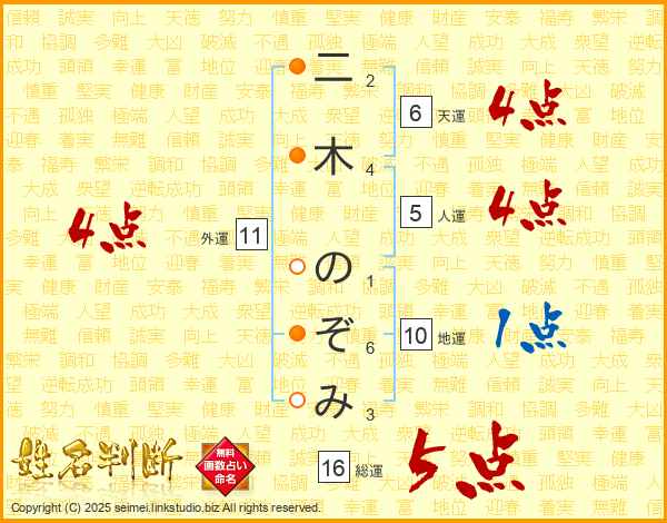 二(2画)木(4画) の(1画)ぞ(6画)み(3画)