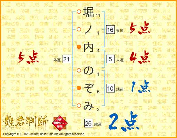 生活面を象徴する運勢です。外部から受ける影響力を表し、結婚運、家庭運や職場、環境への順応性を表します。総運から人運を引いた画数。姓や名が1文字の場合を除く。