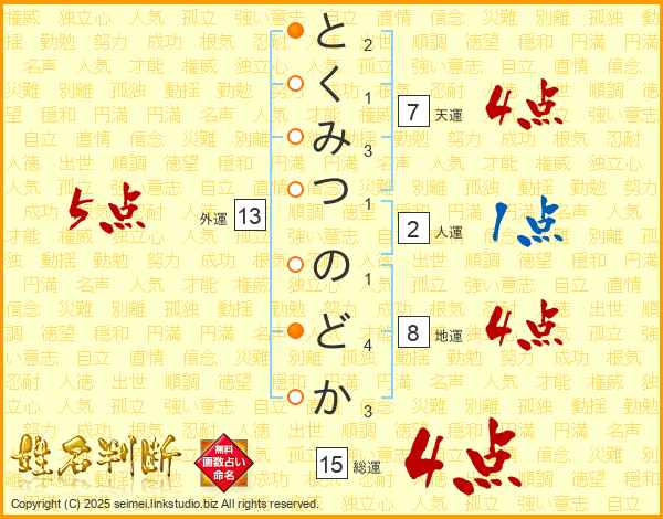生活面を象徴する運勢です。外部から受ける影響力を表し、結婚運、家庭運や職場、環境への順応性を表します。総運から人運を引いた画数。姓や名が1文字の場合を除く。