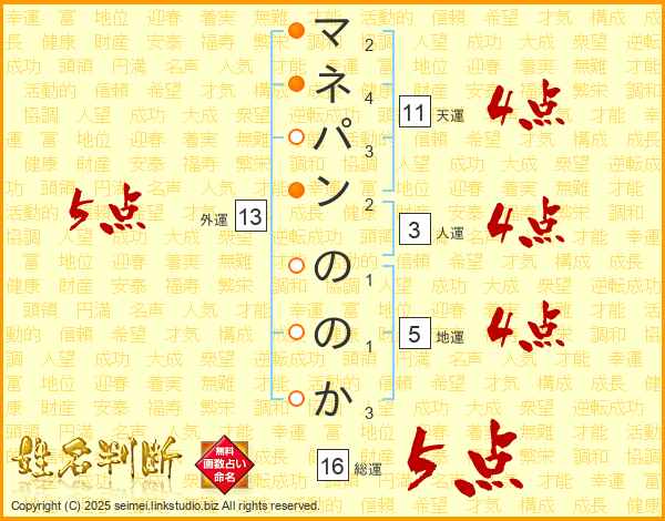 マ(2画)ネ(4画)パ(3画)ン(2画)  の(1画)の(1画)か(3画)