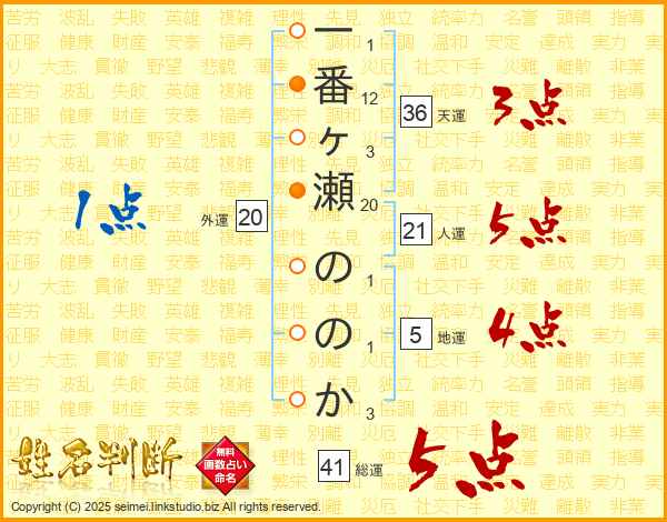 一番ヶ瀬ののかさんの総運は41画の5点!