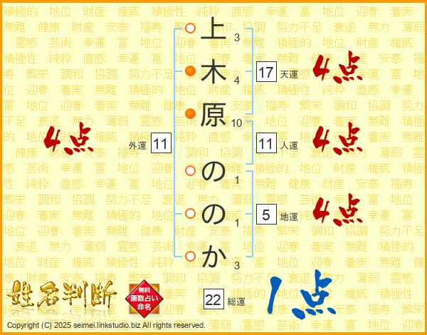 生活面を象徴する運勢です。外部から受ける影響力を表し、結婚運、家庭運や職場、環境への順応性を表します。総運から人運を引いた画数。姓や名が1文字の場合を除く。