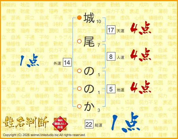 城(10画)尾(7画) の(1画)の(1画)か(3画)