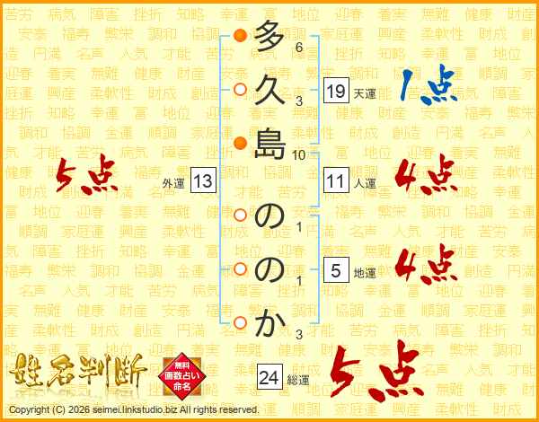 多(6画)久(3画)島(10画) の(1画)の(1画)か(3画)