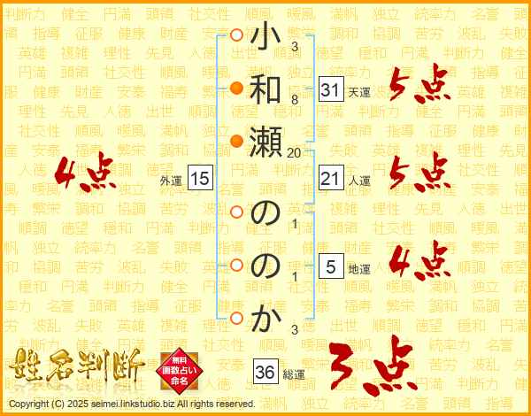 生活面を象徴する運勢です。外部から受ける影響力を表し、結婚運、家庭運や職場、環境への順応性を表します。総運から人運を引いた画数。姓や名が1文字の場合を除く。