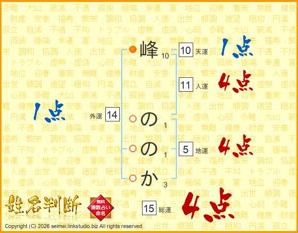 生活面を象徴する運勢です。外部から受ける影響力を表し、結婚運、家庭運や職場、環境への順応性を表します。総運から人運を引いた画数。姓や名が1文字の場合を除く。