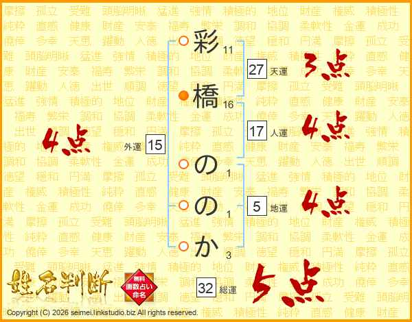 彩(11画)橋(16画) の(1画)の(1画)か(3画)