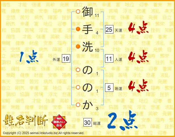 生活面を象徴する運勢です。外部から受ける影響力を表し、結婚運、家庭運や職場、環境への順応性を表します。総運から人運を引いた画数。姓や名が1文字の場合を除く。