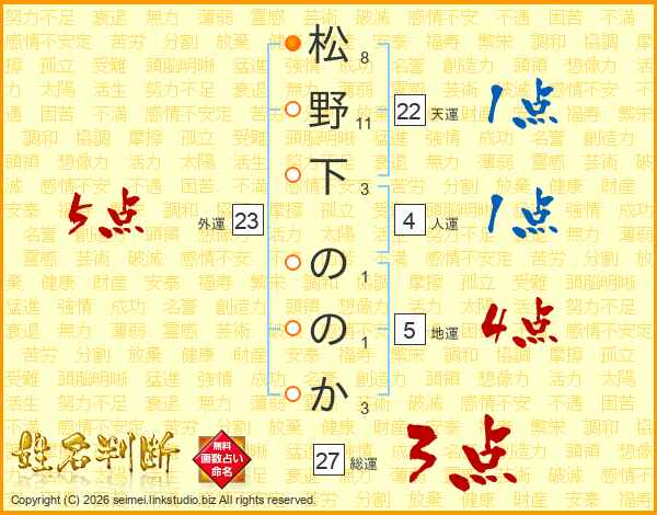 松野下ののかさんの総運は27画の3点!